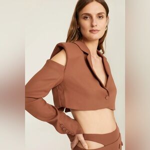 Stylish brown cropped blazer featuring unique cut-out sleeves. Perfect for a chic look.