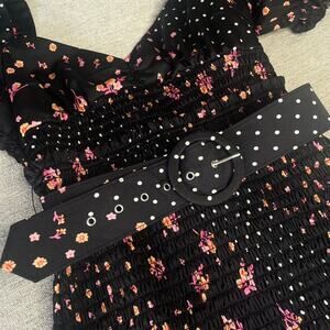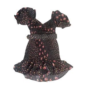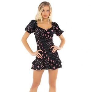 FOR LOVE & LEMONS Camellia Smocked Belted Mini Dress Small Black Pink Floral