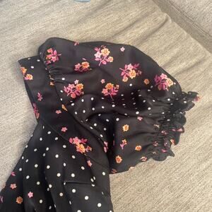 Mini dress printed in a mix of polka dot and floral pattern. The double ruffle layer hem and puffed sleeves elevate its chic style.