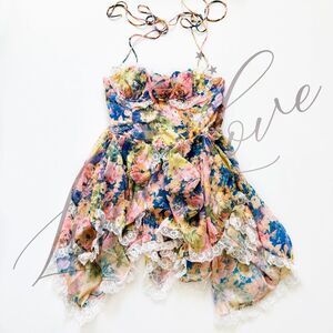 NWT! For Love & Lemons Elea Asymmetrical Mini Dress. Crafted in recycled chiffon, the Elea pink mini dress cuts an ethereal aesthetic with its abstract floral print and a draped handkerchief cut layered skirt. This floral dress features ruched underwire cups with ruffles, a corset-like bodice with boning, and ruffles throughout.