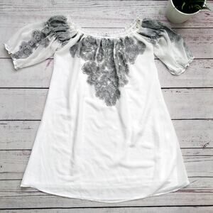 This is a beautiful For Love & Lemons off-the-shoulder tunic. Grey embroidery. No size tag, but fits like medium - please see the measurements. In great, gently used condition. Measures approximately 17" across chest and 26" (back) - 28.5" (front) in length.
