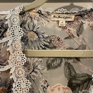 Only worn once. Silk floral print with delicate velvet details. Plunging neckline with pretty crochet lace details. Non smoking house. Lined. No pulls/tears/stains