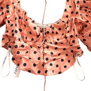 Pink polka dot poplin top. Square neckline. Puffy half sleeves. Ruching on bust and an open back with tie strap details. Made of rose petals. New with tags! Size XS