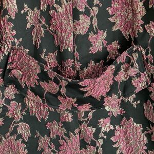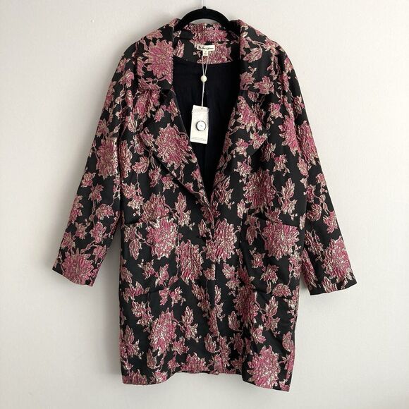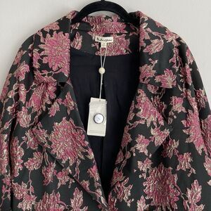FOR LOVE & LEMONS Luella Jacket Womens Medium Floral Metallic Jacquard Layering. Anthropologie For Love & Lemons women's Luella jacket. Blazer type jacket. Long sleeves. Button closure. 100% polyester. Black base with beautiful pink and gold metallic design. Size medium. Measured laying flat: measures 20.5" from armpit to armpit. Measures 28" from mid tag to end of sleeve. Measures 30.5" long from top of tag to front hem and 33" to back hem. New with tags. Bold, sassy, soft, fun, eccentric, pretty, party. Retails for $278.