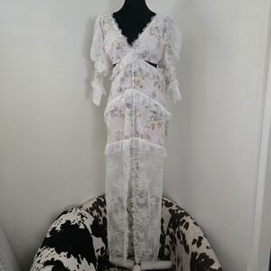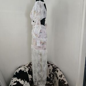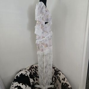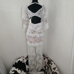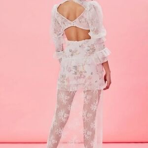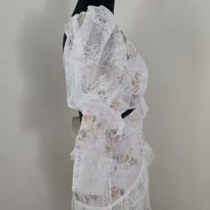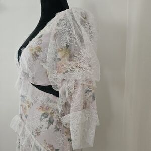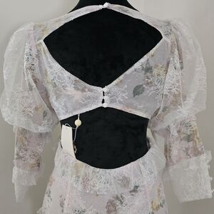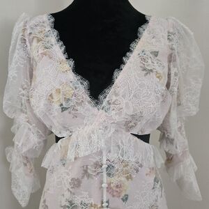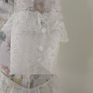 Sheer lace overlay with ruffle detail and front button accents