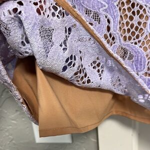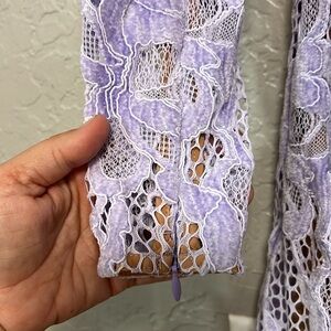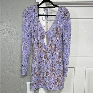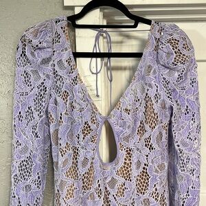 Women’s gorgeous purple lace dress For Love & Lemons Long sleeve, deep V-Neck, fully lined, keyhole at chest, scoop back & skinny tie at back.