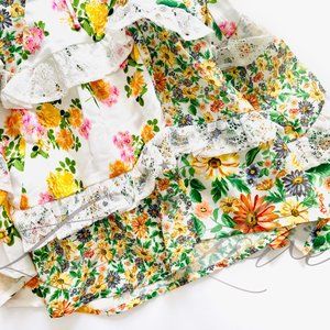NWT! For Love & Lemons Rosalyn Mini Dress in Green. Dreamy patchwork garden and carnation print mini dress featuring fresh white floral lace paneling throughout, feminine shirred bust and waist, and romantic long puff sleeves. Floating paneled handkerchief ruffle hem, dramatic low back with delicate tie. Fully lined.