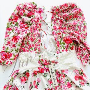 NWT! For Love & Lemons Rosalyn Mini Dress in Pink. Dreamy patchwork garden and carnation print mini dress featuring fresh white floral lace paneling throughout, feminine shirred bust and waist, and romantic long puff sleeves. Floating paneled handkerchief ruffle hem, dramatic low back with delicate tie. Fully lined.