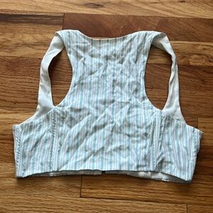 Skyler is a picnic-ready bustier style crop top featuring thin shimmering lurex stripes and a sweetheart neckline. Delicate hook and eye closure at front with boning. Fully lined.
