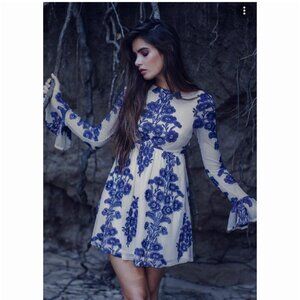 The Temecula Mini Dress looks incredibly whimsical and feels like instant romance. This gorgeous mini dress is delicately constructed from a semi-sheer mesh material with intricate Mediterranean inspired floral embroidery. Featuring long sleeves with flouncy trim, high neckline and a flowing lightly lined skirt. Lovely pre-owned condition. About 15" pit to pit, 13" across the waist, and 31" shoulder to hem. Smoke free home but we do have pets. BIN26