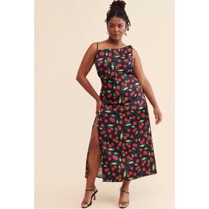 Cherry printed dress w/ an asymmetrical neckline and back cutout