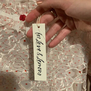 NWOT (had brand tag and return tag but not price tag) For Love & Lemons Aphrodite mini dress with cut out eyelet detail. Slip dress underneath, puff sleeves, and collar accent. Fully lined except for in the sleeves. No callouts to note. Stock photo added for reference from the website.