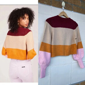 The Hailey Striped Cardigan is a color blocked, ribbed, cropped knit with a crew neckline, slight puff sleeves with cuff and center front tortoise shell buttons