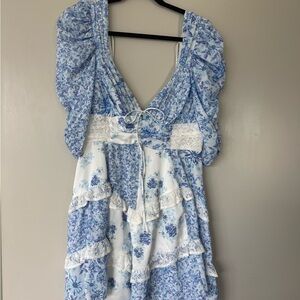 Elegant floral dress featuring a beautiful blue and white pattern. Perfect for any occasion.