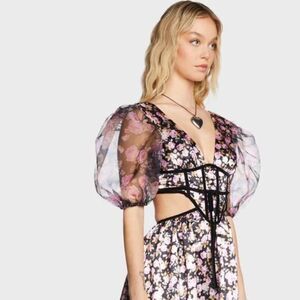what's your love language? This midi dress has a vintage-inspired floral print all over, a satin construction, short organza puff sleeves, contrasting trim, waist and back cutouts, back hook-and-eye closures, and a zip closure.