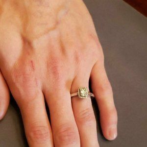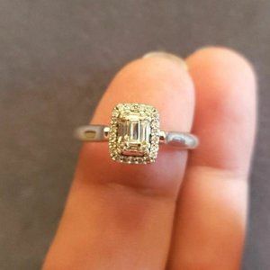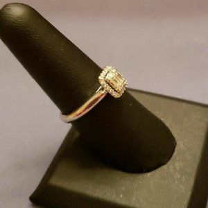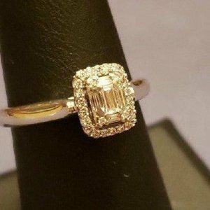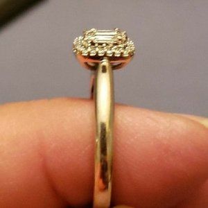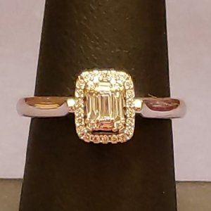 This ring gives you the illusion of an emerald cut diamond but it is actually 3 baguettes horizontal in center, 2 going vertical & then 1 small diamond in each corner, then a halo of diamonds around the setting sz.7 1/2 they are a very nice color & clarity. It's a beautiful ring