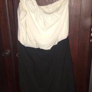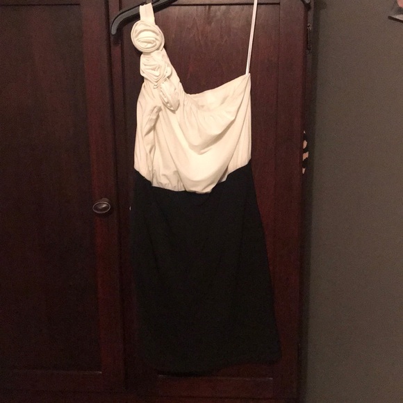 GOOD CONDITION. WORN ONCE. From Dillard’s. White and black fitted cocktail dress with roses on the strap. Very fitted size 7/8.
