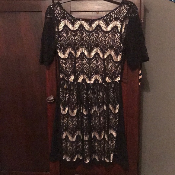 EXCELLENT CONDITION. WORN ONCE. Black lace with pale blush silk underneath. 3 quarter sleeve. MISSING BELT.