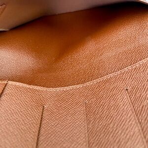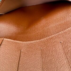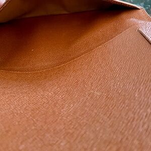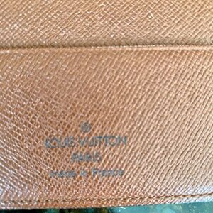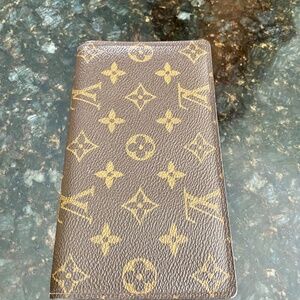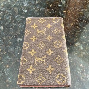 This is my original checkbook wallet in monogram canvas. Graduation gift (along with a matching passport cover) from my parents. Back when we used American Express traveler’s cheques! Credit card slots were hardly used, not stretched out. There is a tiny bit of glazing missing from one exterior corner, but no damage to canvas or leather interior. Comes with sleeper bag and box. No absurdly low offers, please. I just spent $7500 on my Pibble who decided to ingest a satin robe sash all the way into her intestines (12.5 hours in ER waiting room on Thanksgiving, finally got into surgery at 1am!). Little pill!