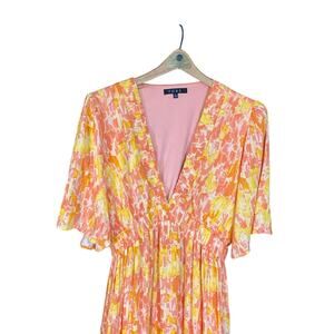 Stunning FORE maxi dress in a vibrant abstract print of orange, yellow, and white. Features a plunging V-neckline, flutter sleeves, smocked waist, and dramatic open back cutout for a breezy, modern look. Full tiered maxi-length skirt with lining. Made of lightweight rayon with a polyester lining. Tagged size Large. Excellent condition—perfect for summer parties, vacation, or boho-inspired styling.