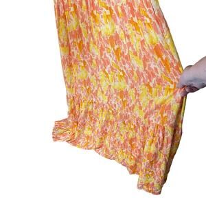 FORE Abstract Print Maxi Dress Orange Yellow Cutout Back Tiered Skirt L boho