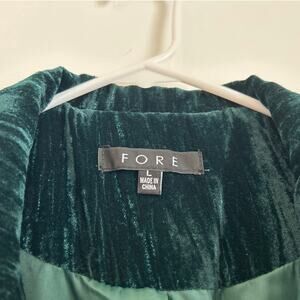 Luxurious and dramatic, this FORE emerald green velvet long coat is a true statement piece. Crafted from a textured velour/velvet fabric, it features a rich jewel-tone sheen, elegant gold-tone double-breasted buttons, and a long, tailored silhouette that instantly elevates any outfit.