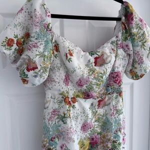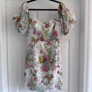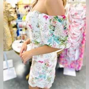 FORE White Lace Floral Print Mini Dress Puff Sleeves L