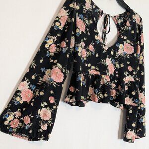 FOREVER 21 Black/Pink Floral V-Neck Long Sleeve Ruffle Crop Top