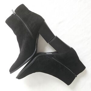 These FOREVER 21 Black Faux Suede High Heel Ankle Boots size 10 are in nearly new condition. Used once. It has a pointed toe and decorative silver zipper on the side. The inner side of the boot has a functional zipper for a sleek and chic fit. It has a 3.25" block heel. The boot is a nod to western cowboy boots but with a city glam twist. Perfect for that trip to Nashville!