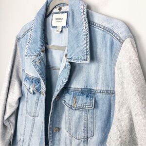 Cute denim jacket by Forever 21. Light wash denim with gray sweatshirt style sleeves. Button front. Pockets. Sleeves have some spots as shown. Otherwise good condition. Womens size medium.