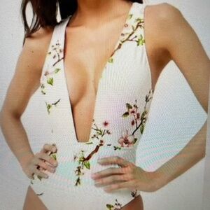 FOREVER 21 CHERRY BLOSSOM DESIGN DEEP NECK PLUNGE ONE PIECE BATHING SUIT SIZE LG
