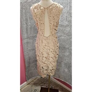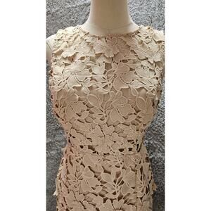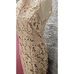 Gorgeous dress from the Forever 21 Contemporary line. Cream - Ivory- Nude color embroidered floral lace overlay - lining is through the bust, open in the midsection and lined skirt. Zips in back of skirt, has a hook/loop at neckline and an open back.