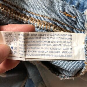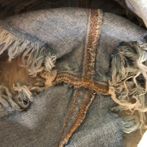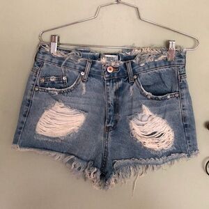 Excellent condition. Factory destroyed denim high waisted shorts in a lighter blue shade. Super clean. Five pockets. Button and zipper fly. Pair this with your favorite tank and you have a perfect summer outfit for any occasion. Smoke-free home. Lay flat measurements are approximately