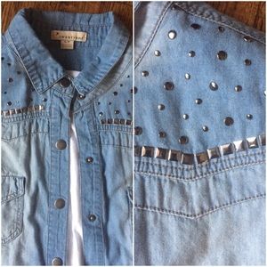 FOREVER 21 Women's embellished chambray shirt. Size small. Button snaps, light denim color, goes with a lot of different pants or skirts. The simple chambray shirt with a little embellishment. Great closet staple for fall and winter. Smoke free and pet free home.