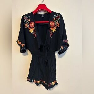 FOREVER 21 Embroidery floral black open front Romper Size S. Y2K Boho Casual