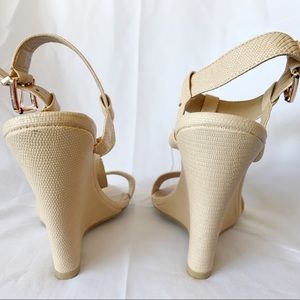 A pair of nude wedges featuring an ankle strap secured by a gold-colored buckle.
