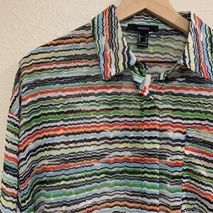 FOREVER 21 SHIRT WOMENS LARGE MUTI COLORED STRIPED SHEER HIDDEN BUTTON UP.