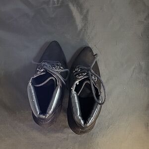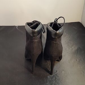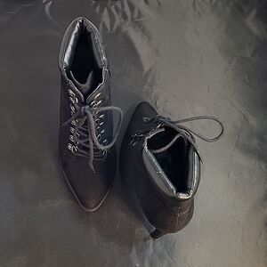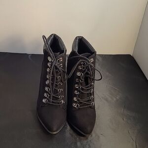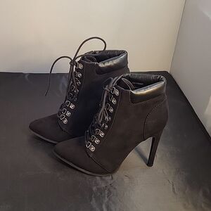 FOREVER 21 SUEDE POINTED TOE LACE UP CLOSURE HIGH HEEL STILETTOS ANKLE BOOTIES SIZE 8 COLOR BLACK MADE WITH TEXTILE UPPER LINING/FORRO TEXTILE 100%POLYESTER OUTSOLE-SUELA/FIRME HEEL HEIGHT MEASUREMENTS APPROX 4".15INCHED THIS ITEMS IS PRE-OWNED EXCELLENT CONDITION WITH ONLY LIGHT SIGNS OF WEAR IF ANY CHECK THE PICTURES (SMALL DAMAGE IN THE INSIDE TOP OF THE BOOT CHECK PICTURES PLEASE)