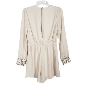 Forever 21 long-sleeved chiffon romper in light blush. Surplice V-neckline, a full keyhole back, fully lined, & sequin-embellished cuffs. Elasticized waist means your comfort will match your cuteness.