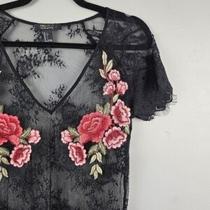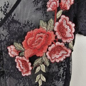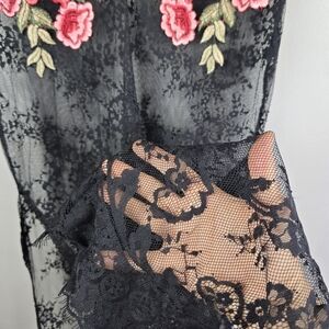 FOREVER 21 Sheer Mesh Midi Dress Black Lace Pink Floral Womens Size L Whimsigoth