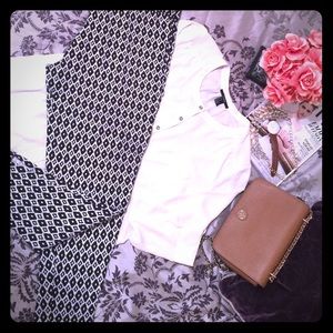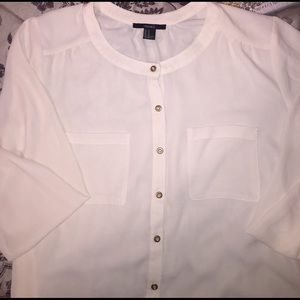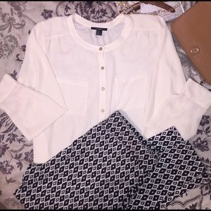 Like new gorgeous silky sheer material ladies button up blouse. Size medium with gold buttons. Stretchy black and white patterned pants also for sale in Size XLG.