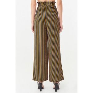 A pair of crepe woven pants featuring a high-rise elasticized paperbag waist, striped print, wide leg, and front faux buttons.- This is an independent brand and not a Forever 21 branded item.