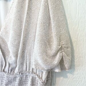 Such a sweet dress from FOREVER 21 featuring a delicate floral print on a tan background, a crossover bodice with a snap closure, elastic detail at the sleeves, elastic smocking at the waist and a ruffle hemline.