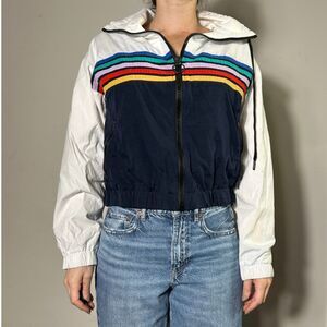 FOREVER 21 White/Navy Zip Up Hooded Striped Jacket Size Medium