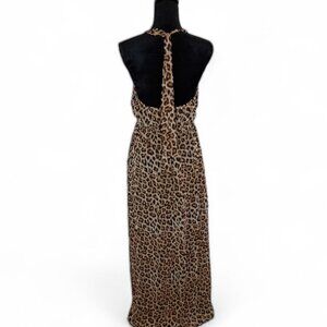 Women's Animal Print Maxi Dress by Forever 21 is a sleeveless halter-neck Maxi dress with a loose gathered bodice with a Flowy skirt. spaghetti straps that tie at the back of the neck, elastic and smocked empire waist that creates a comfortable and forgiving fit. An all over classic leopard/animal print in traditional Tan, Brown, and Black spots on a beige/khaki background. It's completely lined in a silky soft fabric of black.