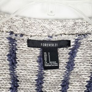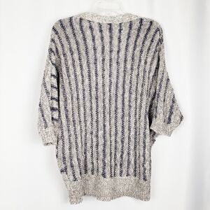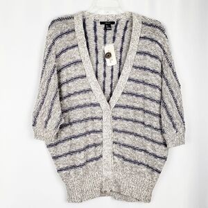 Forever 21 longer short sleeve cardigan sweater in gray and navy blue stripe. Snap button closure. Great layering piece