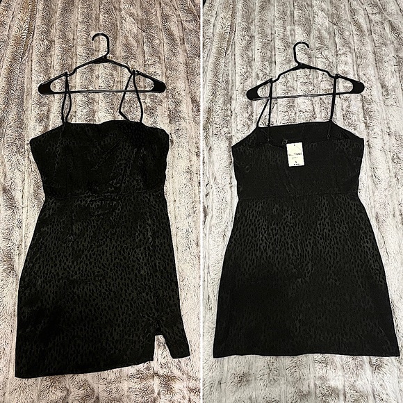 Never worn woven leopard print mini black dress. Small front slit US size L stretchy