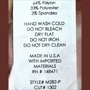 : Material is 64% Rayon,33% Polyester & 3% Spandex.