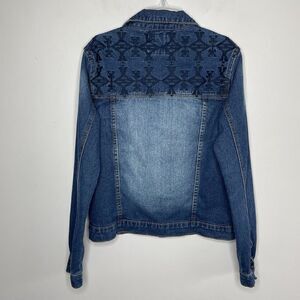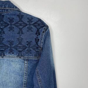 FOREVER 21 Womens Aztec Embroidered Denim Jacket Small S Blue Distressed Cotton