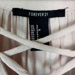 FOREVER 21 Nude Pink Bell Sleeve V-neck Mesh Detail Ruffle Blouse in preowned condition. Small pulls in the back (see 8th photo).